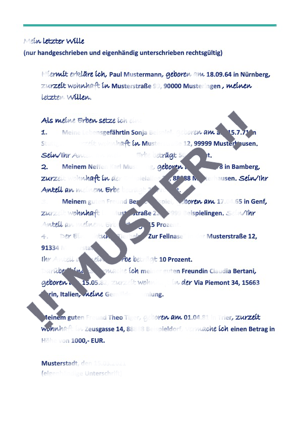 Der Inhalt dieser Mustervorlage wurde von Experten verfasst und gesammelt. Sie soll Sie dabei unterstützen, ein offizielles Privattestament zu erstellen, und enthält somit die typischen Formulierungen, mit denen der Erbgeber den Nachlass nach seinen Vorstellungen regeln kann. Sie umfasst jedoch nicht die für jeden Einzelfall vorzunehmenden möglichen Anpassungen und muss daher mit großer, fachkundiger Sorgfalt an die individuellen Bedürfnisse angepasst werden. Diese Anpassungen sollten speziell bei einem umfassenden und komplex zu regelnden Nachlass nur mit fachkundiger Hilfe, etwa durch einen Anwalt oder einen Notar, vorgenommen werden. Sämtliche Formulierungen dieser Vorlage sind in diesem Zusammenhang als eine Hilfestellung anzusehen und besitzen keinerlei rechtsverbindliche Gültigkeit. Wenn Sie diese Vorlage als Basis für die Erstellung Ihrer Nachlassregelung verwenden, übernimmt der Verlag keinerlei Haftung, auch die Haftung für leichte Fahrlässigkeit wird grundsätzlich ausgeschlossen. Wir empfehlen ausdrücklich die zusätzliche Konsultation eines rechtskundigen und rechtsverbindlichen Beistands Ihres Vertrauens in allen vertragsrechtlichen und juristischen Belangen.