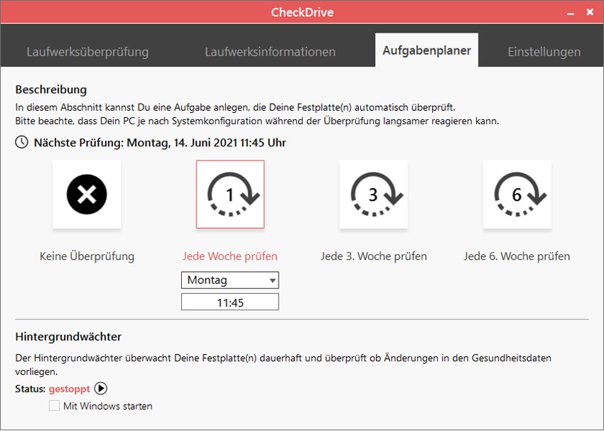 Die neue Version CheckDrive bietet eine automatische Überprüfung an. Sie erlaubt es, die Festplatten regelmäßig in einem selbst gewählten Intervall zu checken. Im integrierten Aufgabenplaner ist es möglich, die Aufgabe und das Intervall zu definieren - ganz simpel per Mausklick.