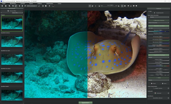Natürlich sind bei DIVE #1 professional auch viele Finetuning-Werkzeuge mit an Bord, die das Ergebnis noch besser machen: 29 Voreinstellungen für spezielle Unterwasser-Lichtsituationen, qualitativ hochwertigste Entrauschungsfilter, Entfernung von störenden Lichtbrechungsfehlern und Wiederherstellung von Spitzlichtern.