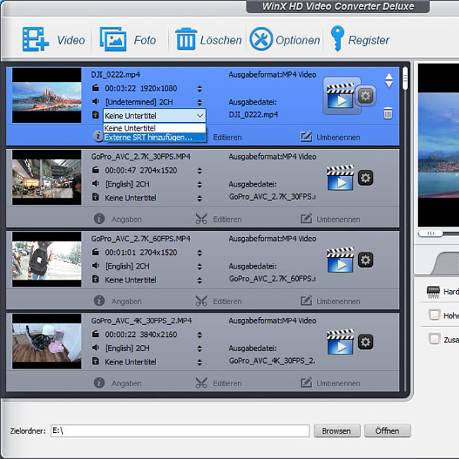 Mit den Videobearbeitungsfunktionen können Sie Videos trimmen, Clips schneiden, um schwarze Balken zu entfernen, mehrere Videodateien zusammenfügen, und vor der Konvertierung Untertitel aktivieren oder externe SRT-Untertitel hinzufügen.