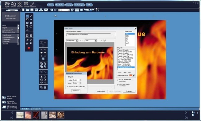 Der Druck in allen gängigen Formaten gelingt komfortabel, ebenso wie der Smartphone-optimierte Export, Upload in soziale Netzwerke oder Versand per E-Mail.
