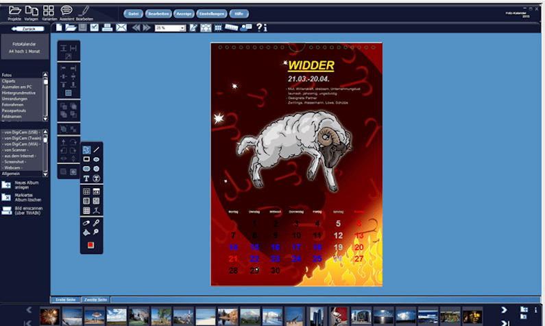 Unter den zahlreichen mitgelieferten Kalenderlayouts finden Sie sicherlich auch Ihren persönlichen Favoriten. Gelungene Text- und Grafikfunktionen erlauben es Ihnen ein vordefiniertes Layout mit ein paar Mausklicks auf Ihre individuellen Vorstellungen anzupassen. Mit dem FotoKalender 2023 erstellen Sie ohne spezielle Vorkenntnisse attraktive Fotokalender mit allen Feiertagen, persönlichen Jahrestagen, eigenen Fotos, Sudokus, Kreuzworträtseln und Horoskop, jedes Jahr aktuell!