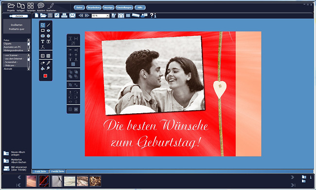 Verleihen Sie Ihrer Karte eine ganz individuelle Note: Importieren Sie ein eigenes Foto, versehen es mit Effekten und fügen noch passende Rahmen, Cliparts oder Hintergründe ein.