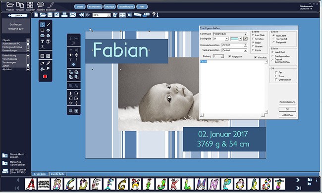 Verändern Sie Texte, fügen Sie eigene Bilder ein und versehen Sie Fotos mit kreativen Effekten. Der Druck in allen gängigen Formaten gelingt komfortabel, ebenso wie der Smartphone-optimierte Export, Upload in soziale Netzwerke oder Versand per E-Mail.