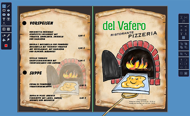 Noch schnell die grafischen Elemente mit eigenen Fotos oder den mitgelieferten Cliparts, Fotos, Hintergründen und Rahmen abändern. Schon kann Ihre persönliche Speisekarte fertig sein.