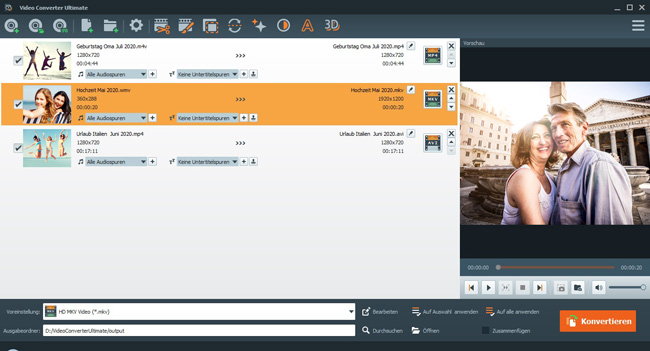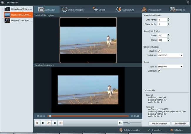 Mit dem AVCHD VideoConverter wandeln Sie Ihre AVCHD MTS/M2TS-Videos in alle gängigen Video- und Audioformate um und konvertieren sie sogar in 3D-Formate mit tollem 3D-Effekt! Darüber hinaus stehen Ihnen viele nützliche Bearbeitungsfunktionen zur Verfügung: Sie können mehrere Videoclips in einer Datei zusammenfügen, Filme drehen oder kürzen, das Videofeld zuschneiden, Wasserzeichen einfügen und diverse Einstellungen anpassen (Helligkeit, Kontrast, Sättigung, Farbton).