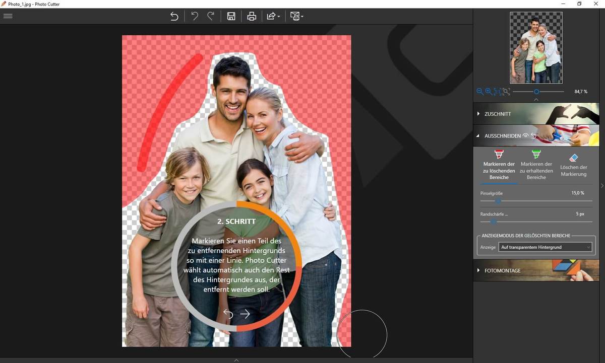Noch nie war es einfacher, Personen und Objekte in Bildern freizustellen. Kurze Tutorials anhand von Beispielfotos helfen Ihnen, schnell zu großartigen Ergebnissen zu kommen. Fotos ausschneiden 4 Pro bietet Ihnen umfassende Möglichkeiten.