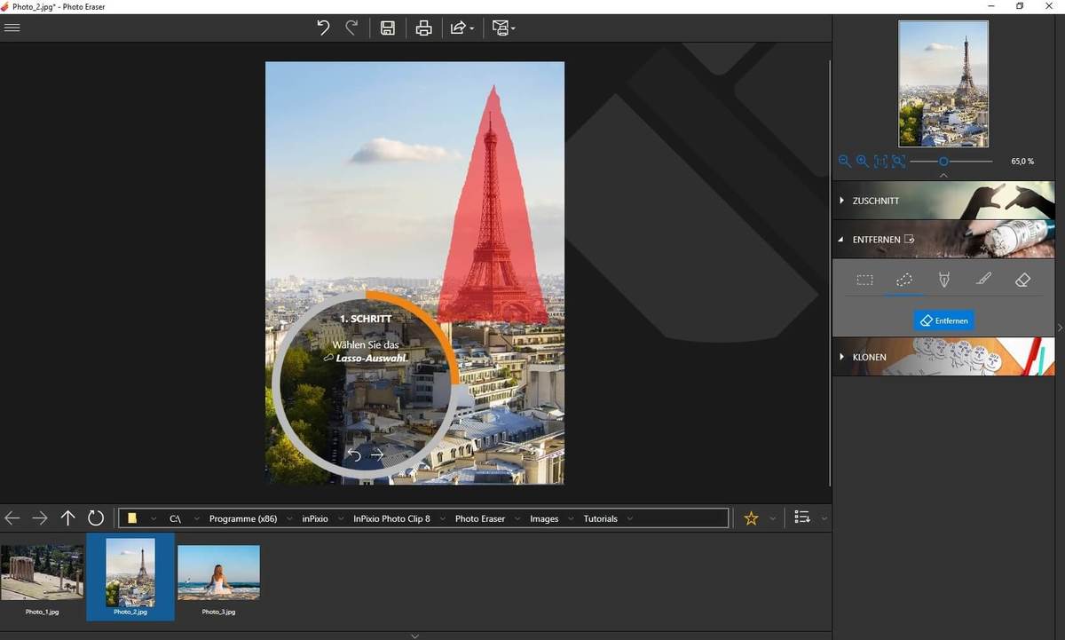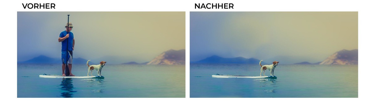 Mit dem Werkzeug Entfernen löschen Sie mit nur einem Klick störende Objekte, Personen oder Wasserzeichen. Die Objekte werden von der Software erkannt und ausradiert. Verwenden Sie diese Funktion auch für die Porträt-Retusche. Entfernen Sie Schönheitsfehler und retuschieren Sie Falten einfach glatt – wie in Hochglanzmagazinen!