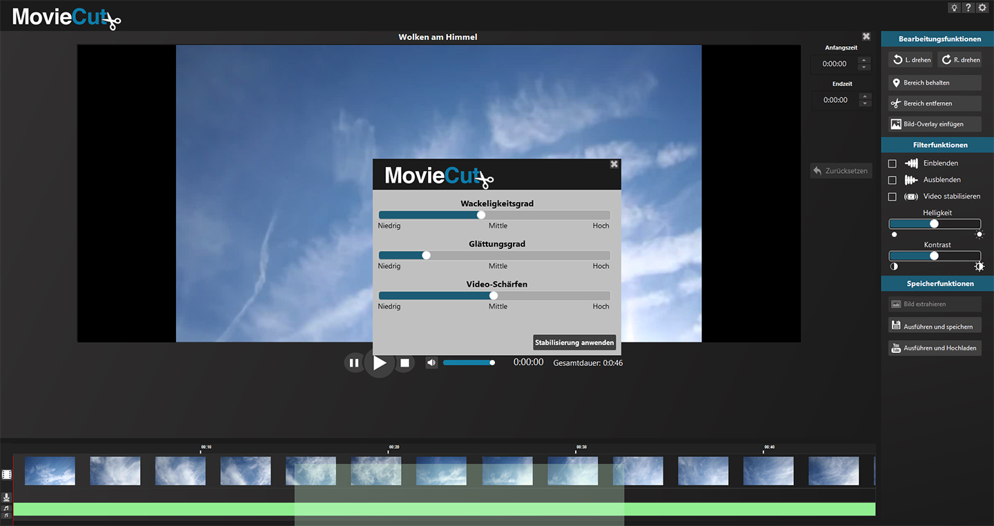 Videos sind mit dem Smartphone oder einer entsprechenden Kamera schnell angelegt. Oft sind sie aber zu groß, zu dunkel, zu langweilig. MovieCut schneidet alle (vom Benutzer markierten) langweiligen Szenen aus einem Video heraus und lässt nur noch die Passagen stehen, die man sich auch gern anschauen möchte. Dabei ist die Software so einfach zu bedienen, dass jeder Anwender sofort vorzeigbare Ergebnisse erzielen kann.