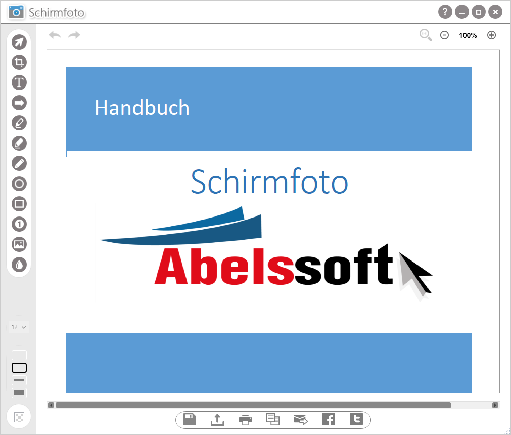 Außerdem ist es kein Problem, bestimmte Bildelemente zu markieren, Textnotizen zu erfassen, ganze Passagen zu schwärzen oder Pfeile zu setzen. Schirmfoto druckt die neuen Bildschirmfotos aus, stellt sie in die Zwischenablage, stellt sie per Mausklick bei Facebook oder Twitter ein oder speichert sie als JPG, PNG oder RTF.
