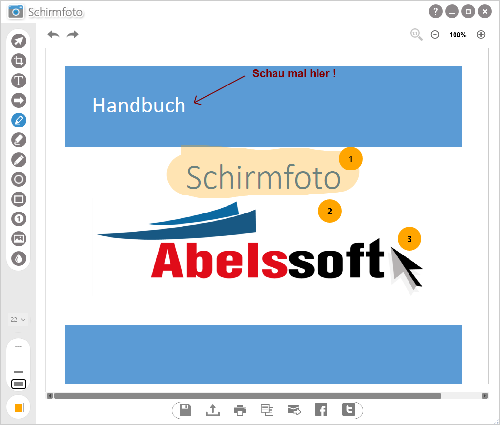 Schirmfoto besitzt einige Bearbeitungsmöglichkeiten wie zum Beispiel eine Markierungs- oder Schwärzungsfunktion.