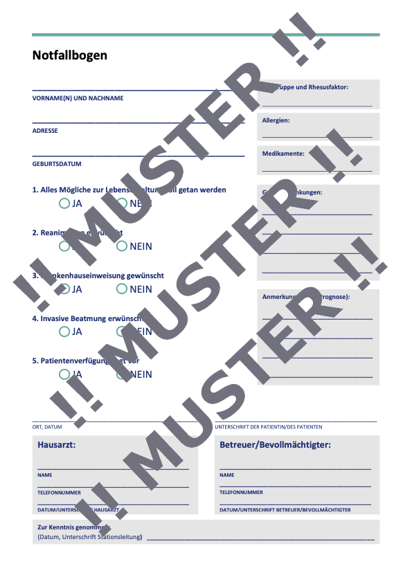Der Inhalt dieser Mustervorlage wurde von Experten verfasst und gesammelt. Sie umfasst jedoch nicht die für jeden Einzelfall vorzunehmenden möglichen Anpassungen und muss daher mit großer, fachkundiger Sorgfalt an die individuellen Bedürfnisse angepasst werden. Diese Anpassungen sollten nur mit fachkundiger Hilfe, etwa durch einen Arzt  vorgenommen werden. Sämtliche Formulierungen dieser Vorlage sind in diesem Zusammenhang als eine Hilfestellung anzusehen und besitzen keinerlei rechtsverbindliche Gültigkeit. Wenn Sie diese Vorlage als Basis für die Erstellung Ihres Vorsorgeplans verwenden, übernimmt der Verlag keinerlei Haftung, auch die Haftung für leichte Fahrlässigkeit wird grundsätzlich ausgeschlossen. Wir empfehlen ausdrücklich die zusätzliche Konsultation eines medizinischen und rechtsverbindlichen Beistands Ihres Vertrauens in allen gesundheitlichen und juristischen Belangen.