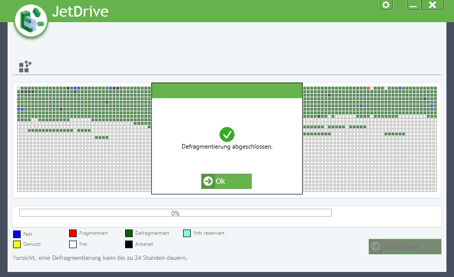 Am Ende der Defragmentierung werden die ausgelagerten Dateien automatisch wieder an die für sie optimalen Stellen der Festplatte geschoben. Dieses Verfahren sorgt dafür, dass die Defragmentierung schneller über die Bühne geht. Das neue Verfahren kommt automatisch zum Einsatz, sobald JetDrive 9 einen Geschwindigkeitsvorteil erkennt. Wichtig ist, dass die Defragmentierung so schnell wie möglich abgeschlossen wird, ohne dass dabei die Qualität der Arbeiten leidet.