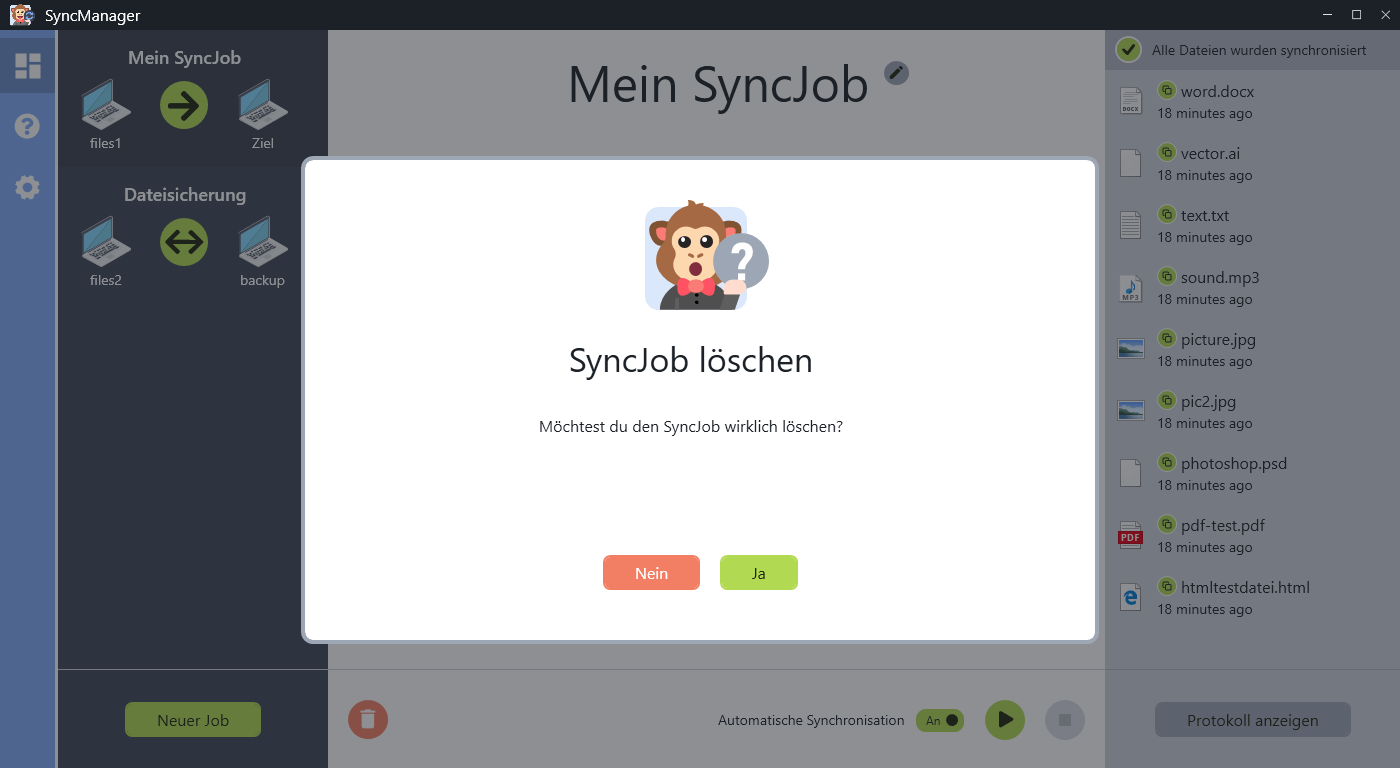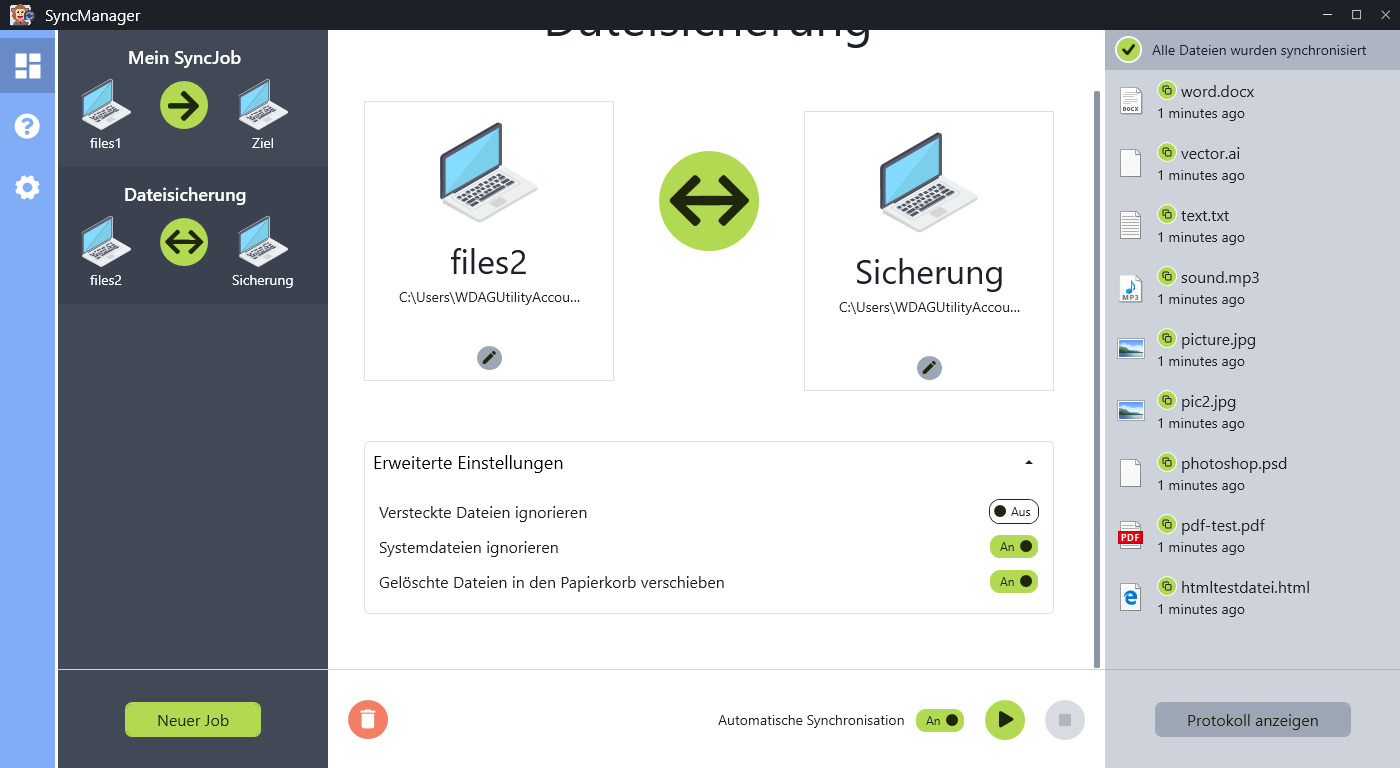 Dabei haben Sie die Wahl, ob Ihr einmal angelegter Sync-Job voll automatisch erledigt werden soll, sobald der SyncManager eine Änderung registriert oder ob Sie manuell die Synchronisation starten wollen.