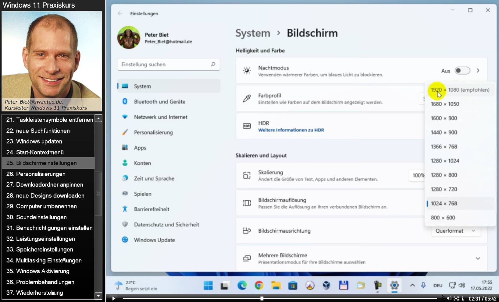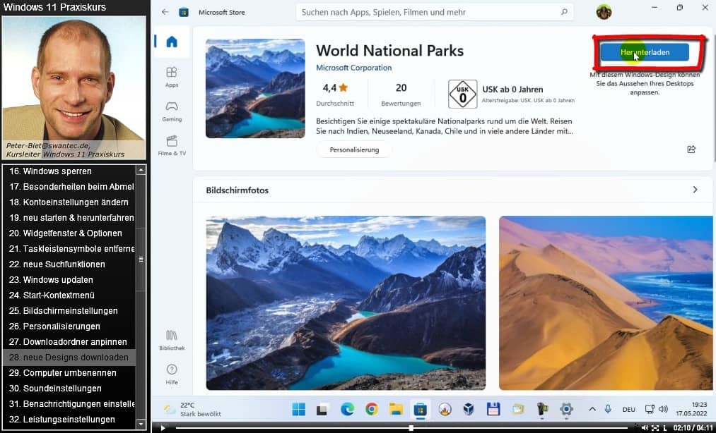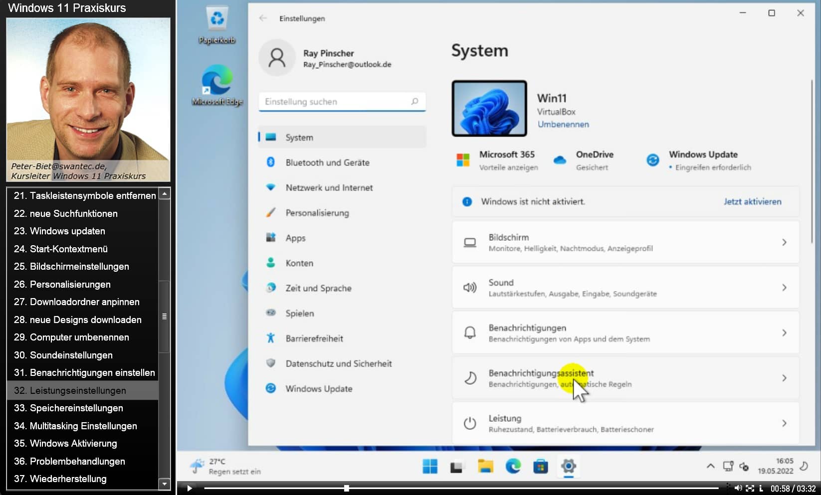 Jeder der 68 Video-Workshops im Windows 11 Praxiskurs ist einem bestimmten Thema gewidmet. Unter einer Hauptüberschrift wie »Virtuelle Desktops oder Personalisierungen« finden Sie spezielle Themenvideos , die in kurzen Sequenzen alles Wichtige Schritt für Schritt aufzeigen.