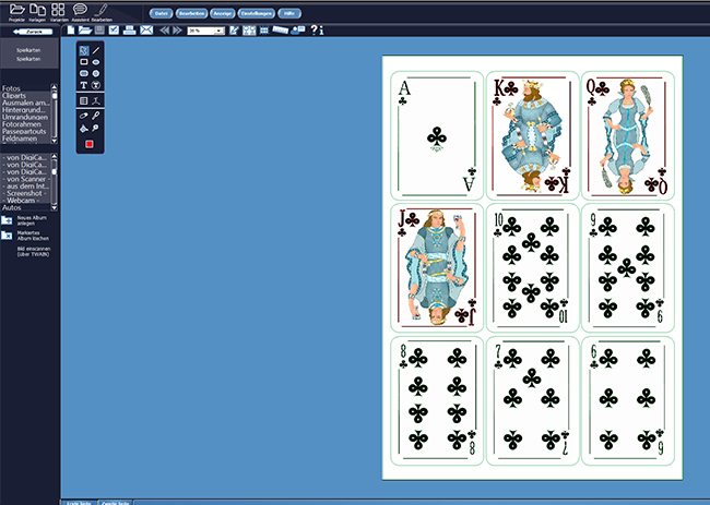 stehen in großer Auswahl zur Verfügung. In jeder fertigen Vorlage tauschen Sie per Mausklick den Hintergrund aus, für jede Spielkarte lassen sich beliebige Cliparts hinzufügen oder Fotos von Ihrer Festplatte einlesen.